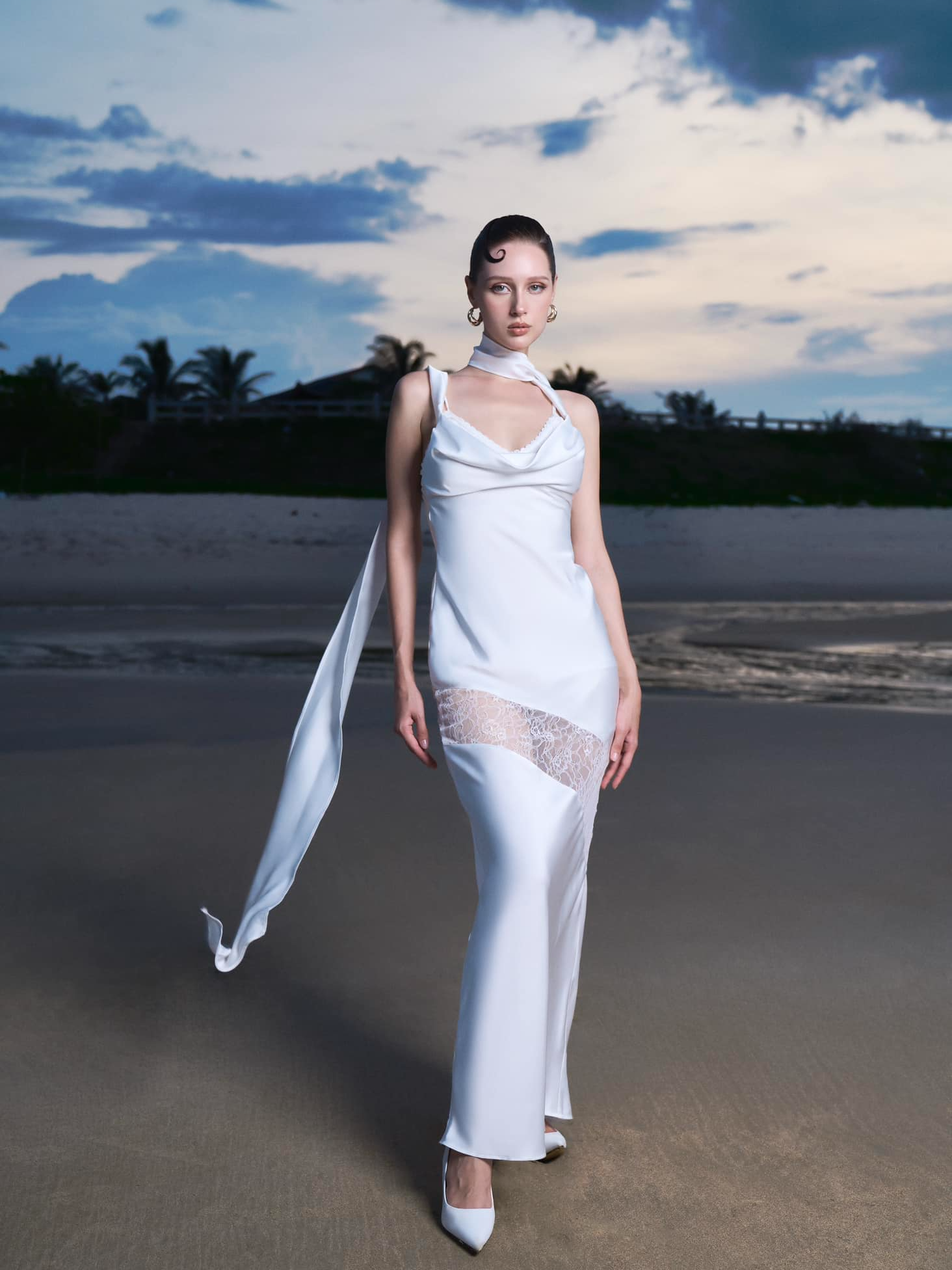 This elegant white lace-panel maxi dress, style code WD240, blends modern sophistication with feminine allure. Crafted from fluid satin, it features a draped cowl neckline and a daring sheer lace panel that cuts diagonally across the skirt for a striking visual effect. The delicate scarf detail drapes gracefully over the shoulder, adding a touch of romantic movement. Perfect for sunset beach events or upscale evening occasions, this dress embodies contemporary glamour and refined sensuality.